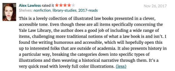 “The book itself is beautiful; it is divided into sections with beautiful typeface and color schemes that complement the full-color images from the collection. The pictures and descriptions are put into context by several essays by scholars and rare book specialists.” — Khelani Clay, Law Library Lights